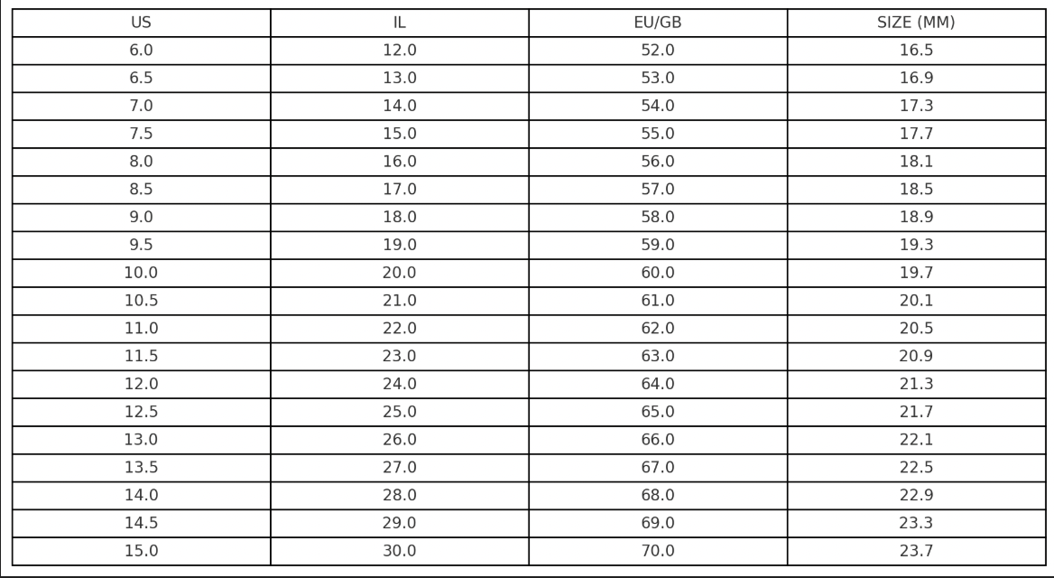 2. לאחר קבלת התוצאה, השתמשו בטבלת ההמרה שבתחתית העמוד כדי להתאים את המידה שקיבלתם למידה האמריקאית.